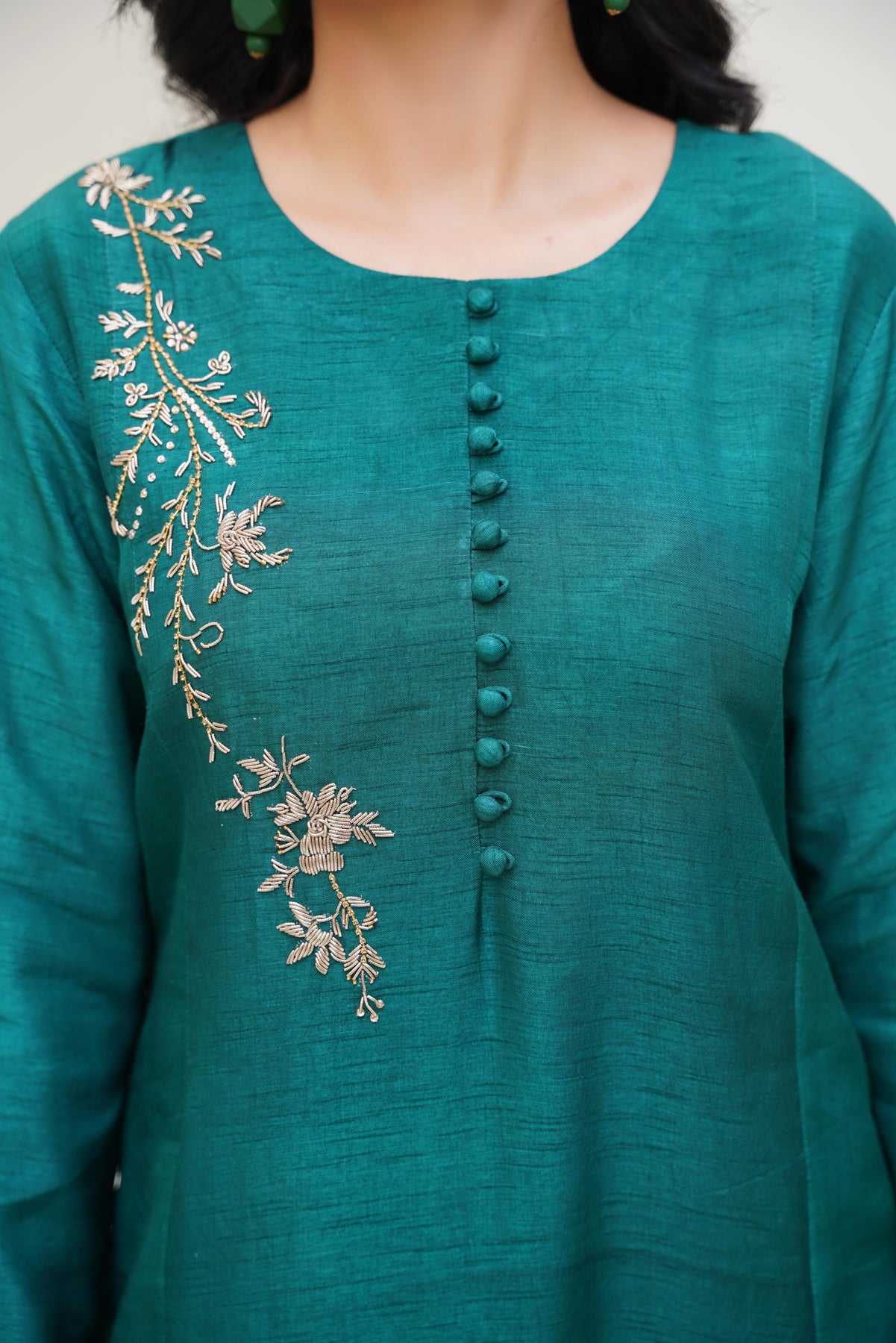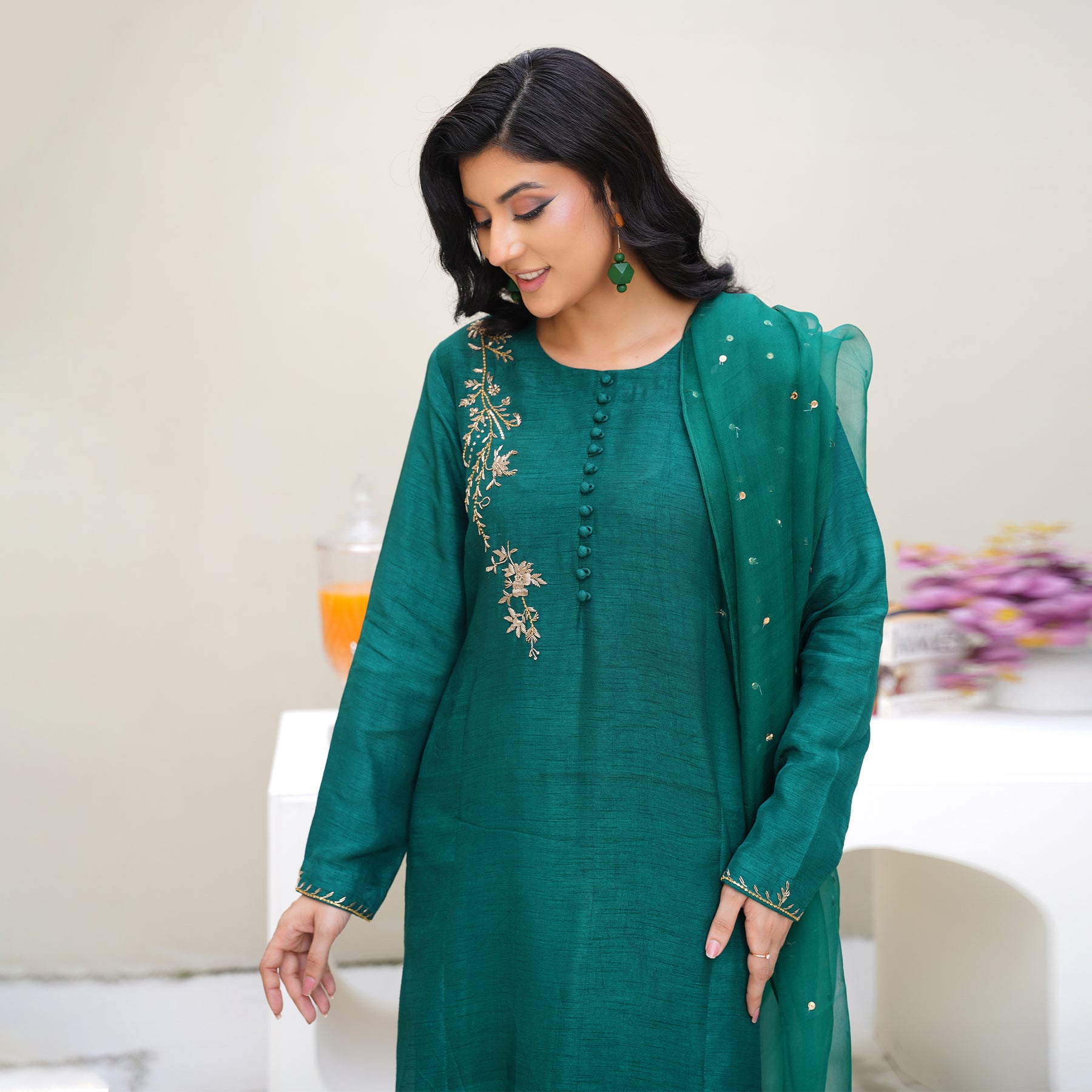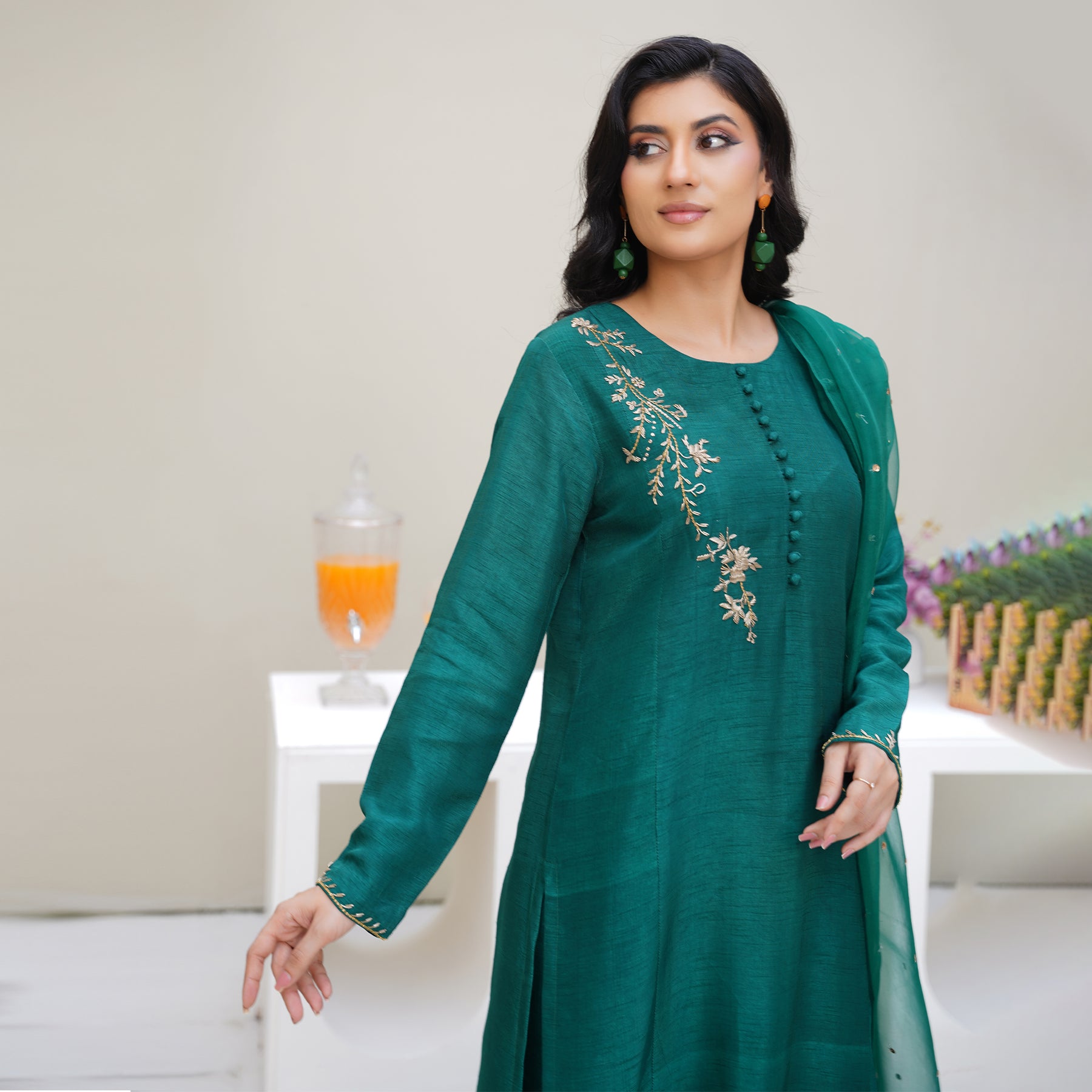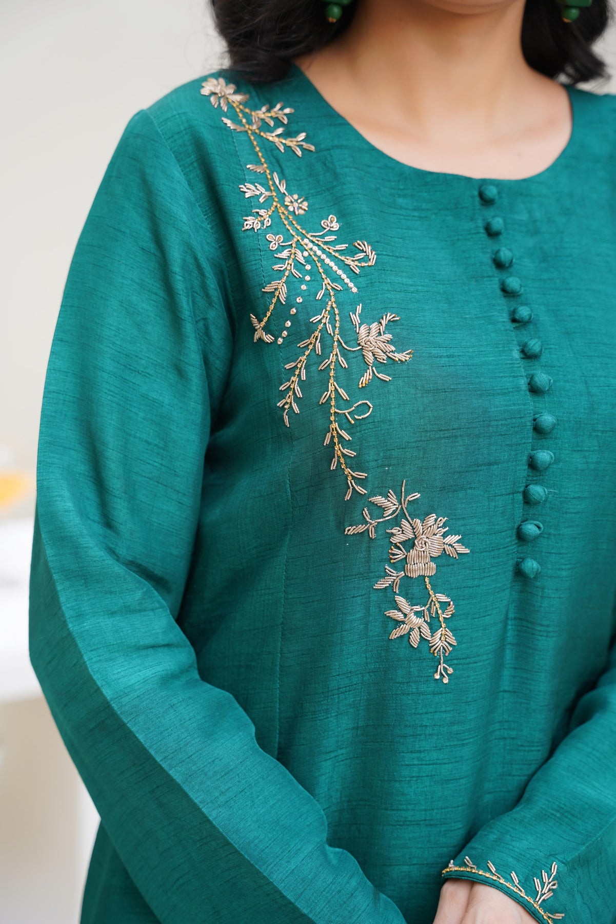 Emerald green dress with Kora & dabka neckline, hand embellishment, trouser detailed with Resham and gold tilla cut work.