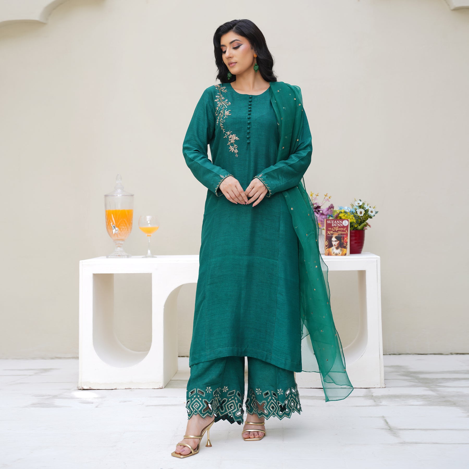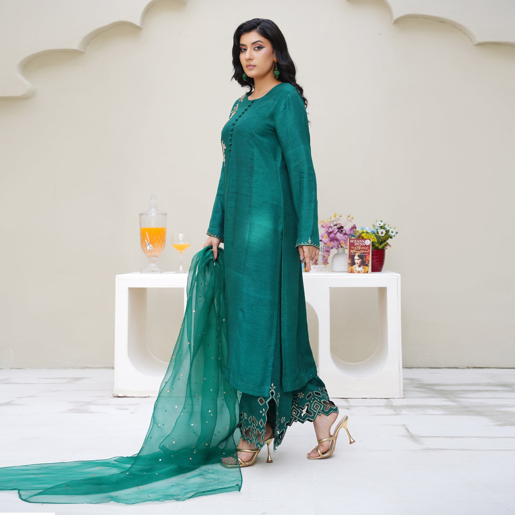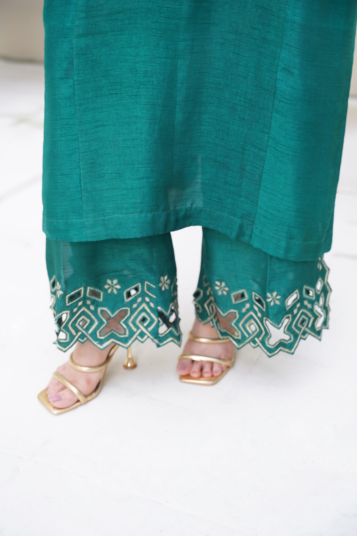 Emerald green dress with Kora & dabka neckline, hand embellishment, trouser detailed with Resham and gold tilla cut work.