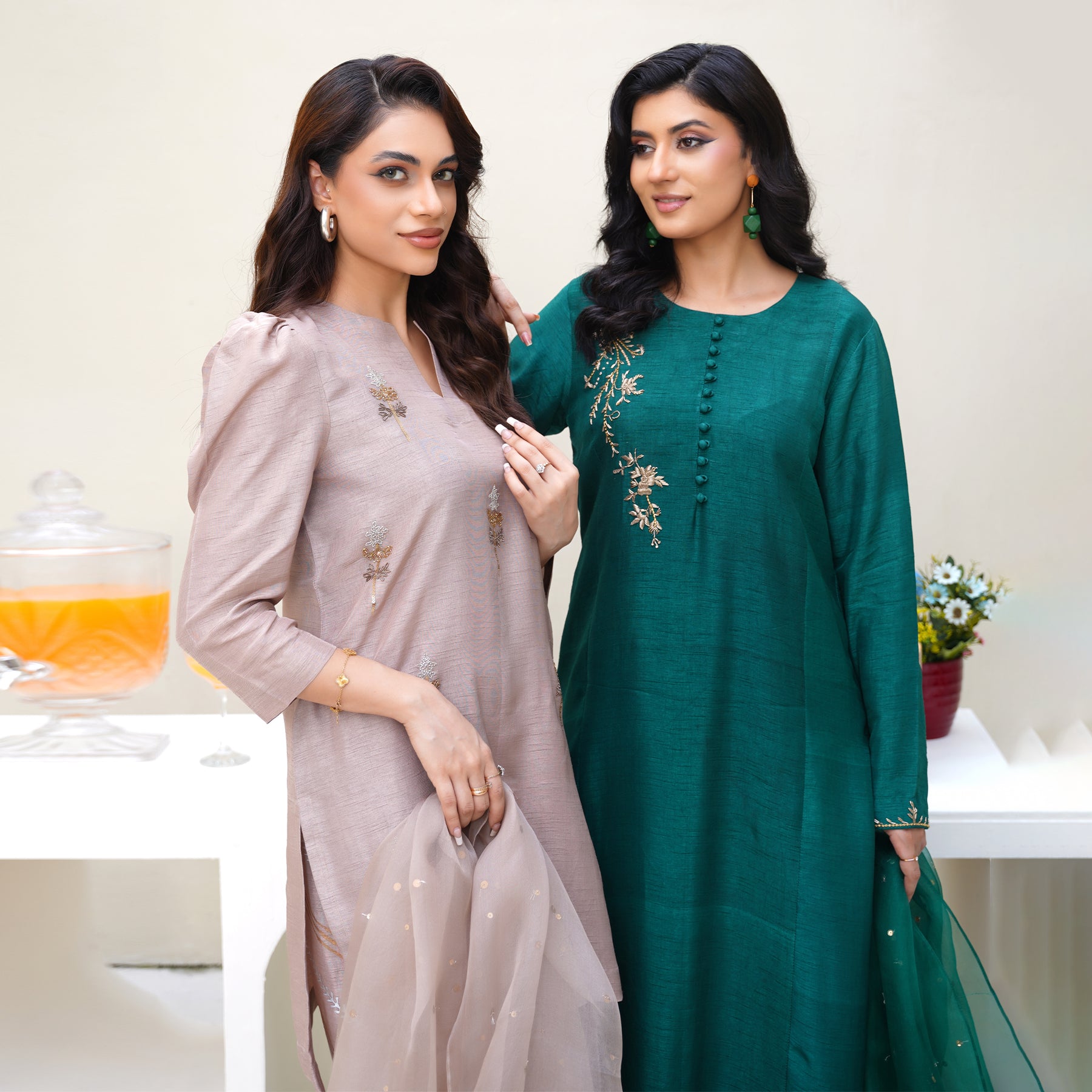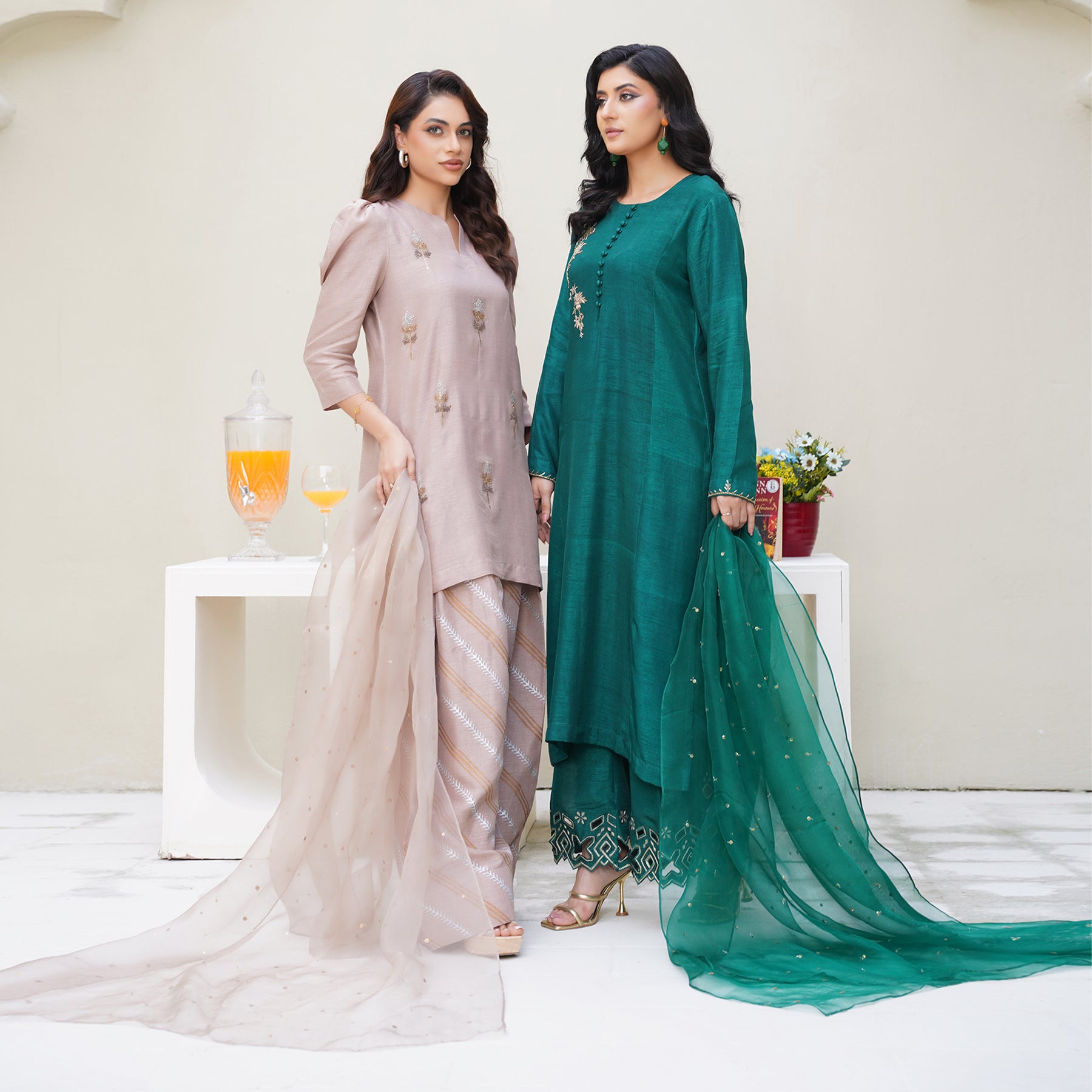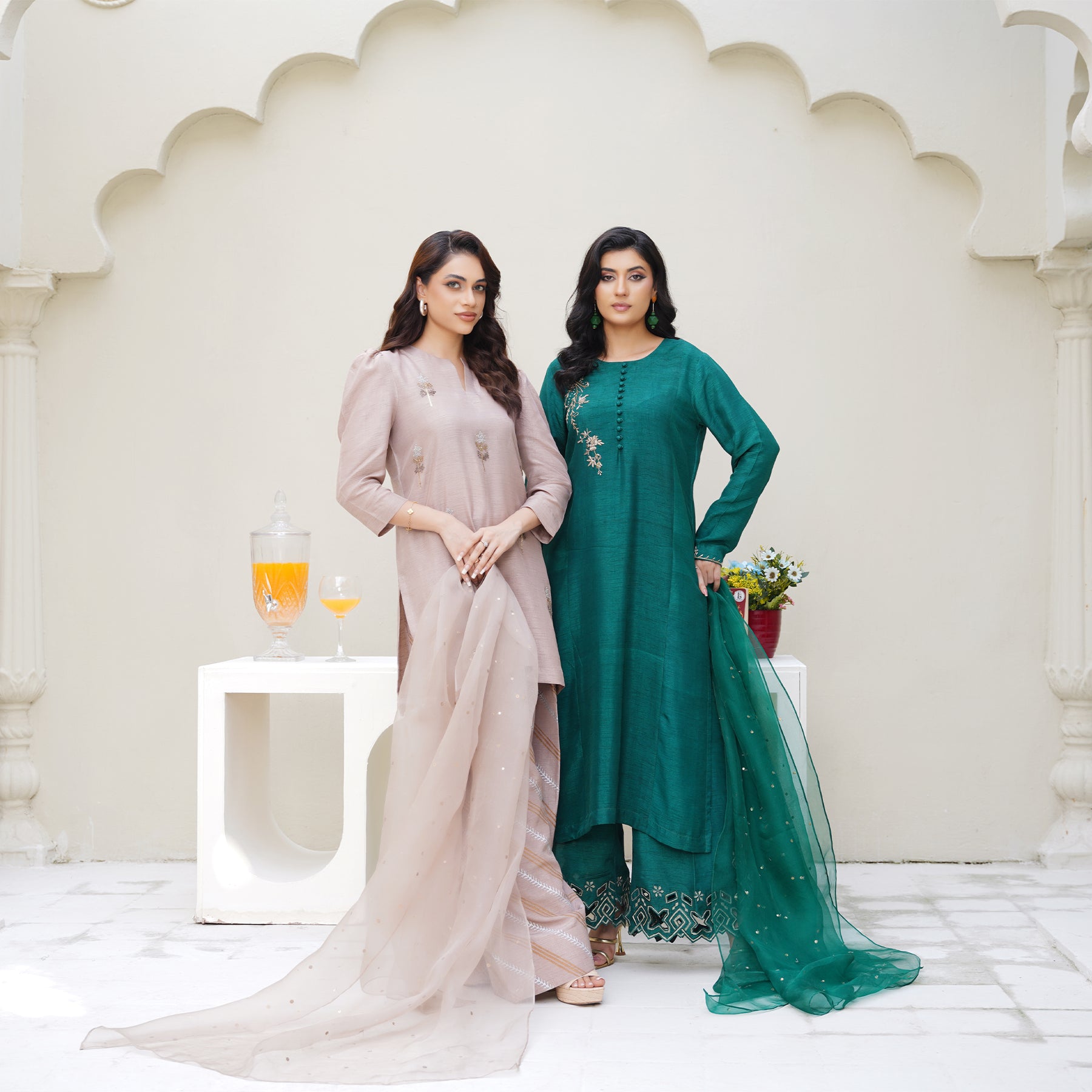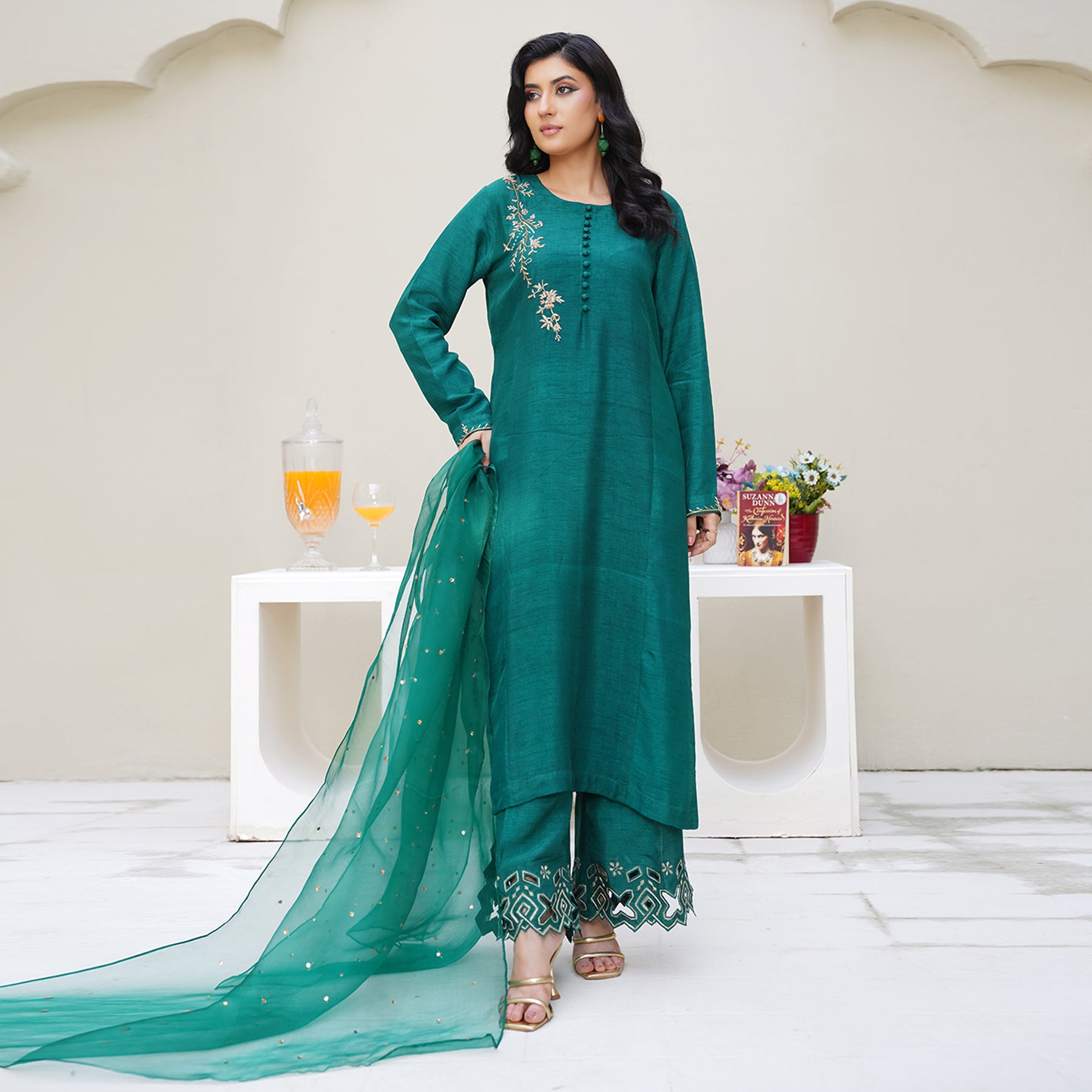 Emerald green dress with Kora & dabka neckline, hand embellishment, trouser detailed with Resham and gold tilla cut work.