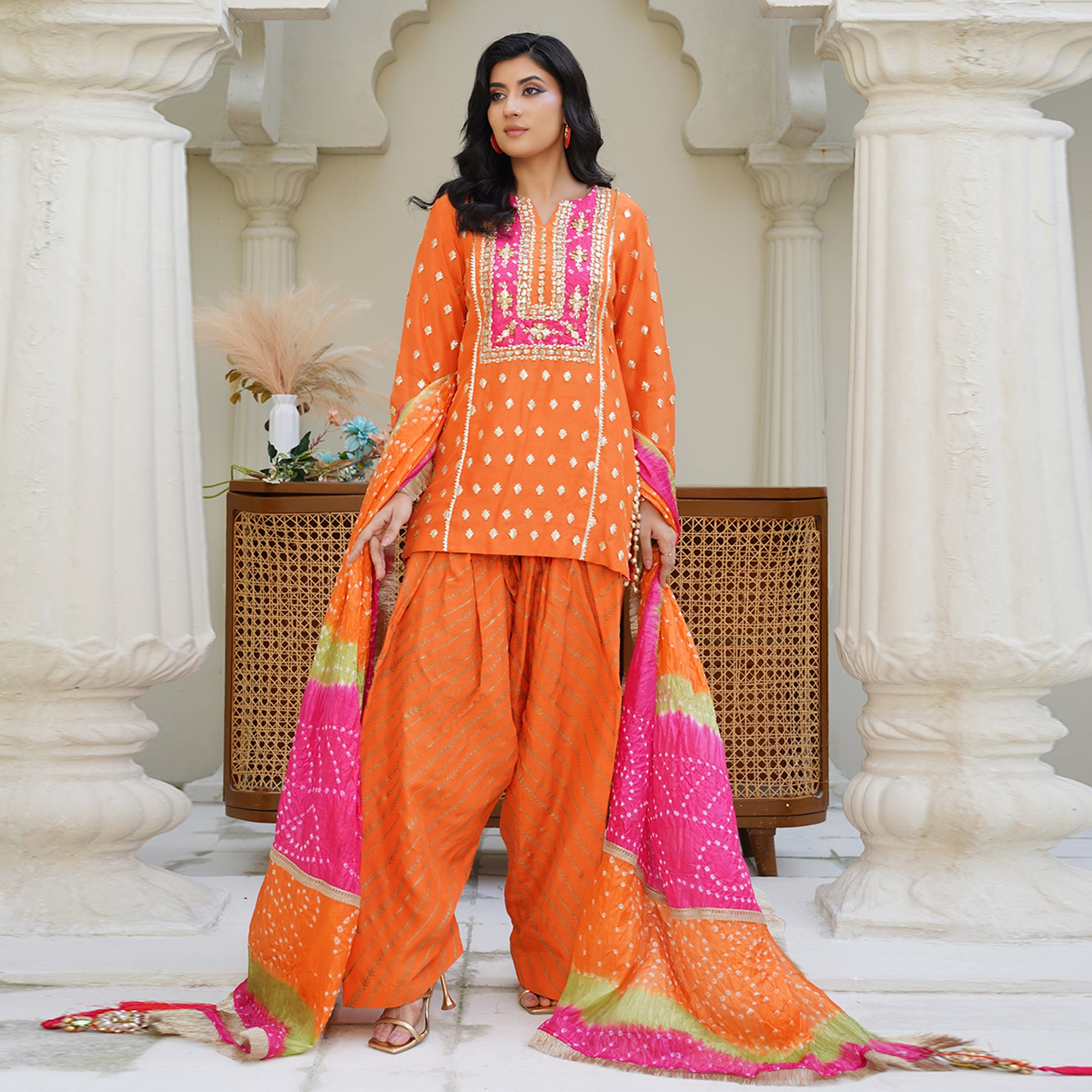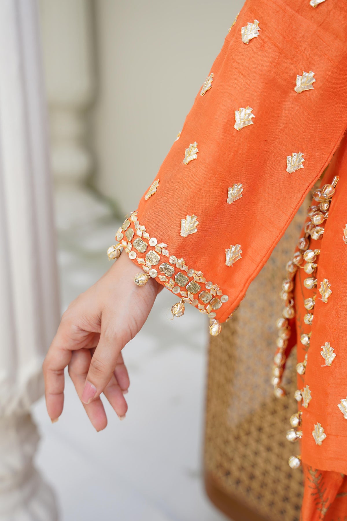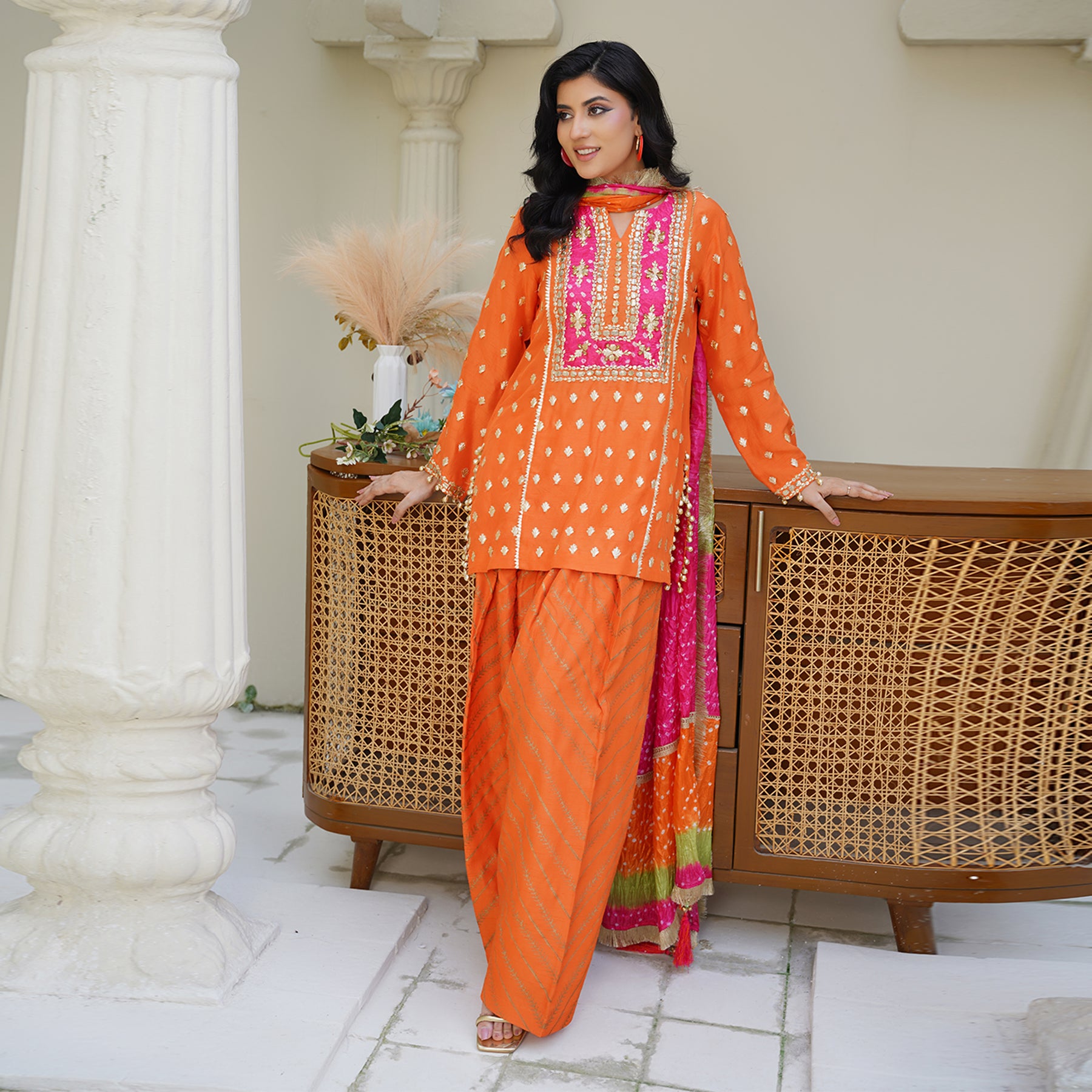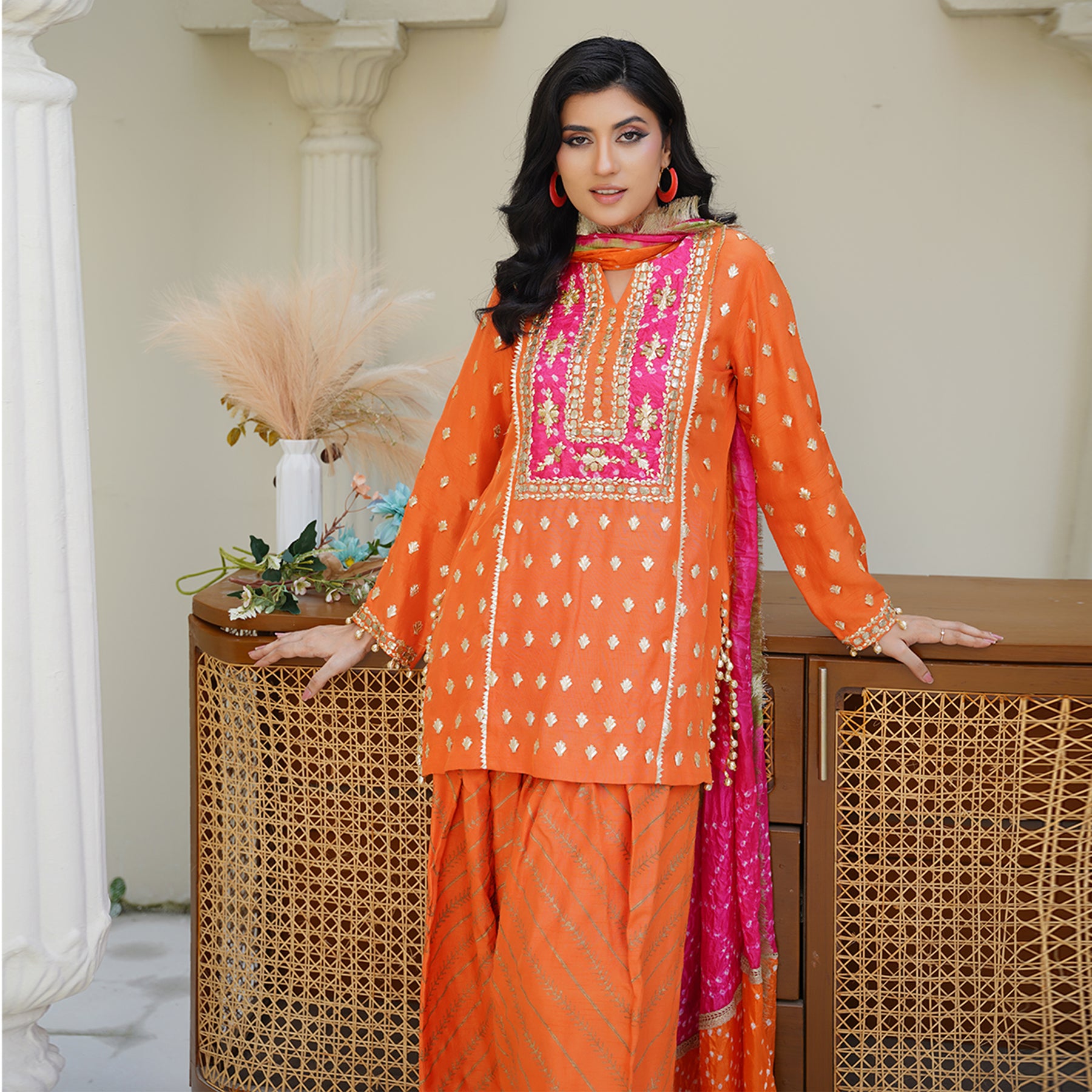 Celebrating tradition with gotta embellishments, chunri artistry, block print accents, and a multi-coloured dupatta with playful tassels, styled with an orange hand worked farshi shalwar