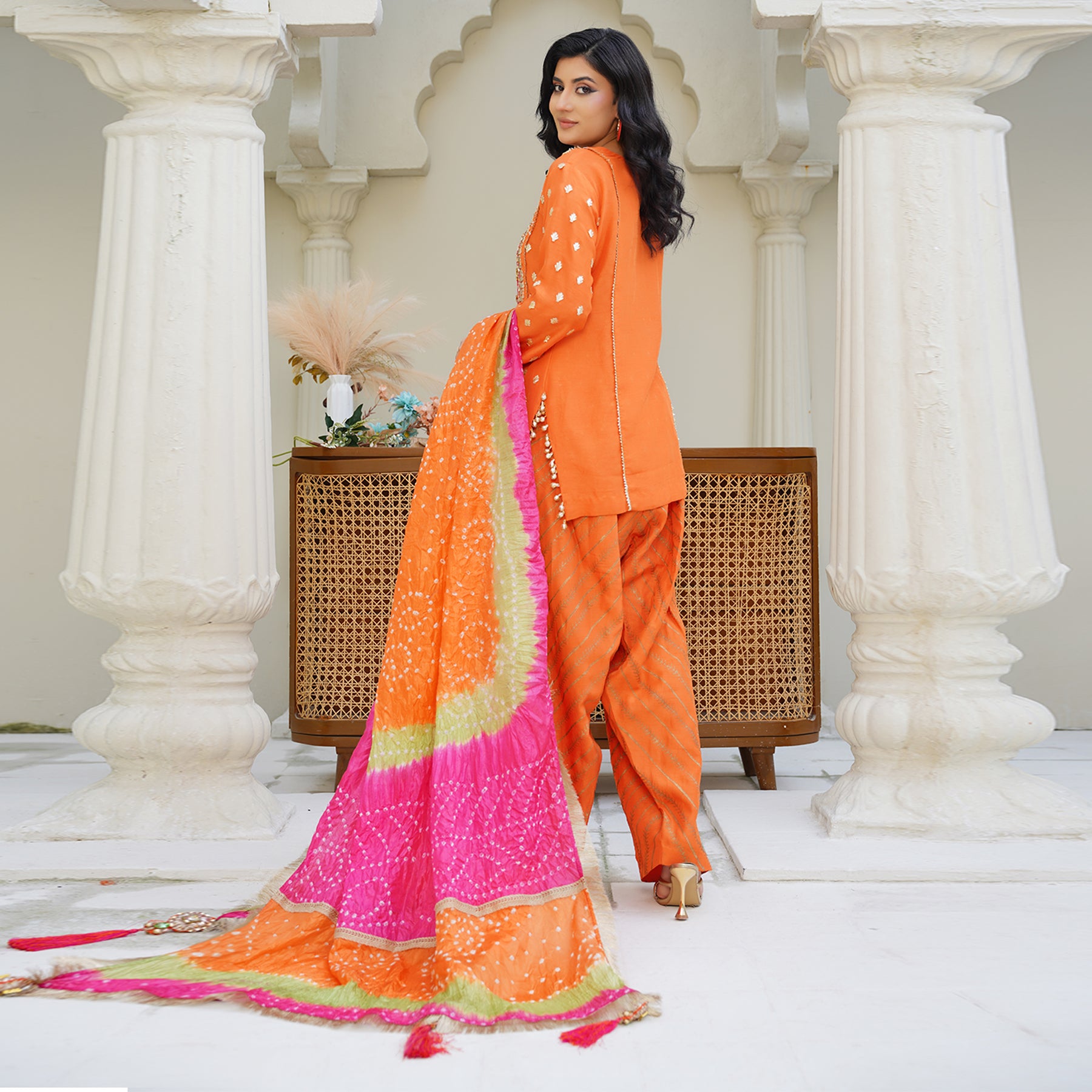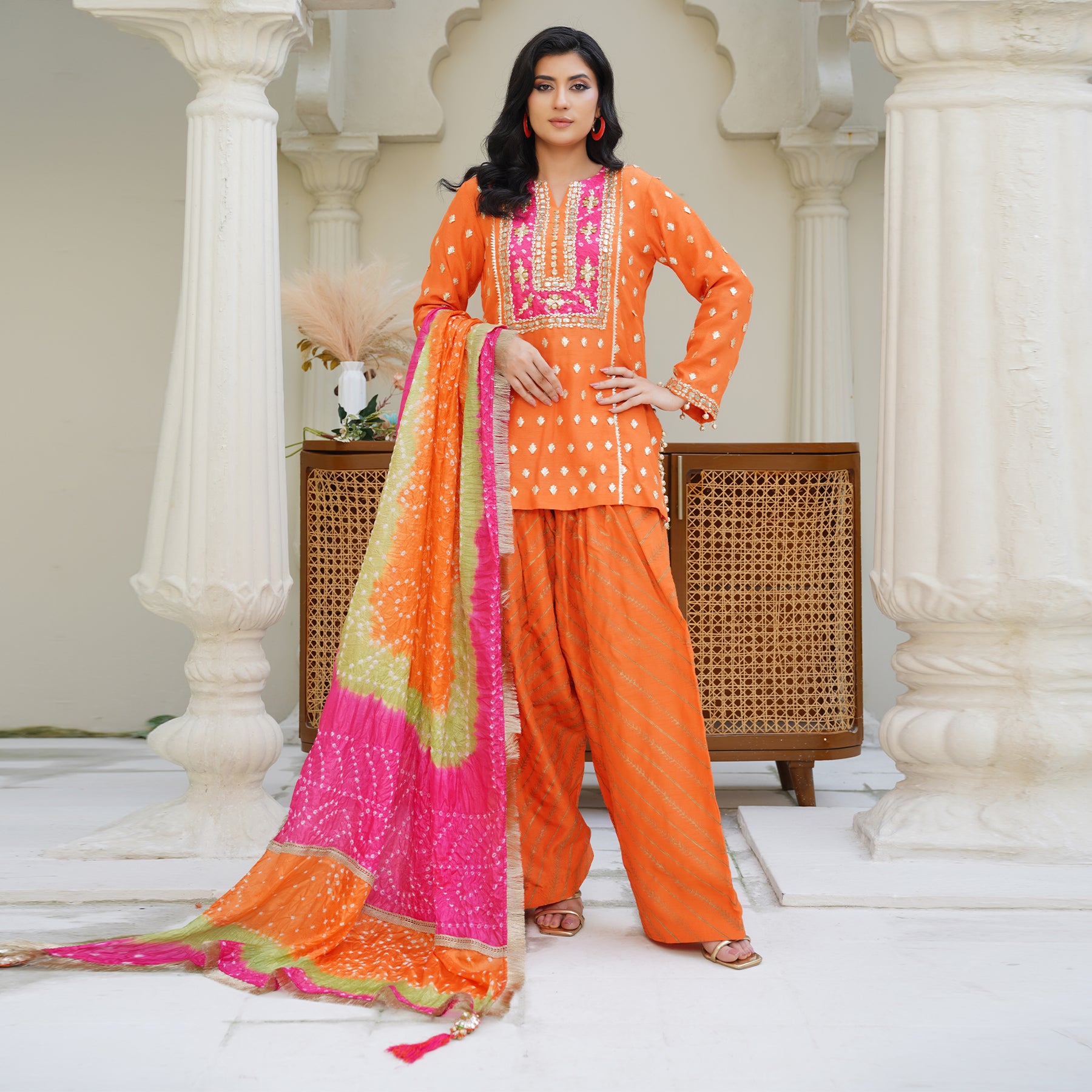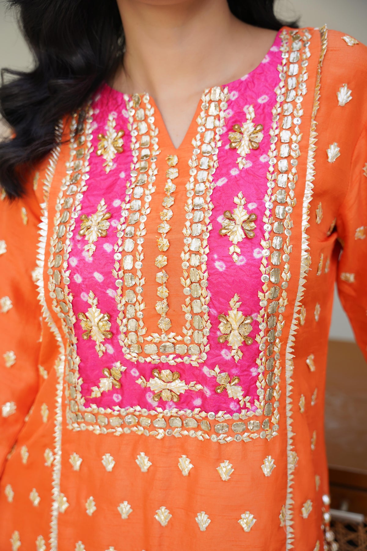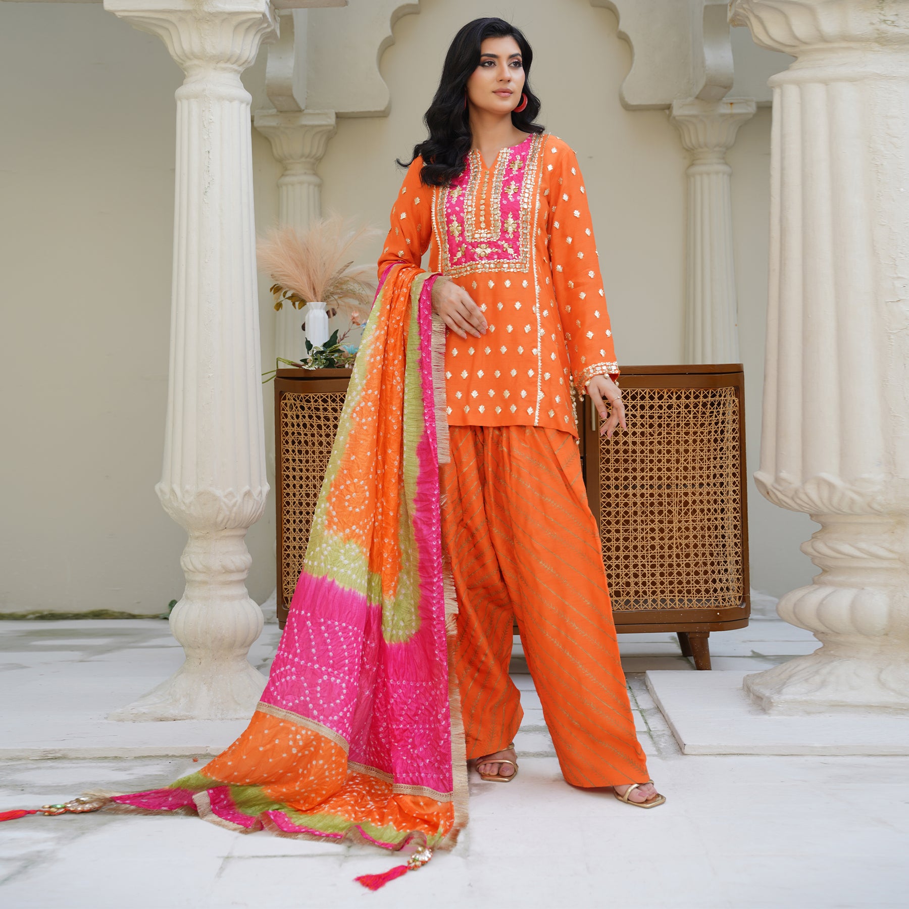 Celebrating tradition with gotta embellishments, chunri artistry, block print accents, and a multi-coloured dupatta with playful tassels, styled with an orange hand worked farshi shalwar